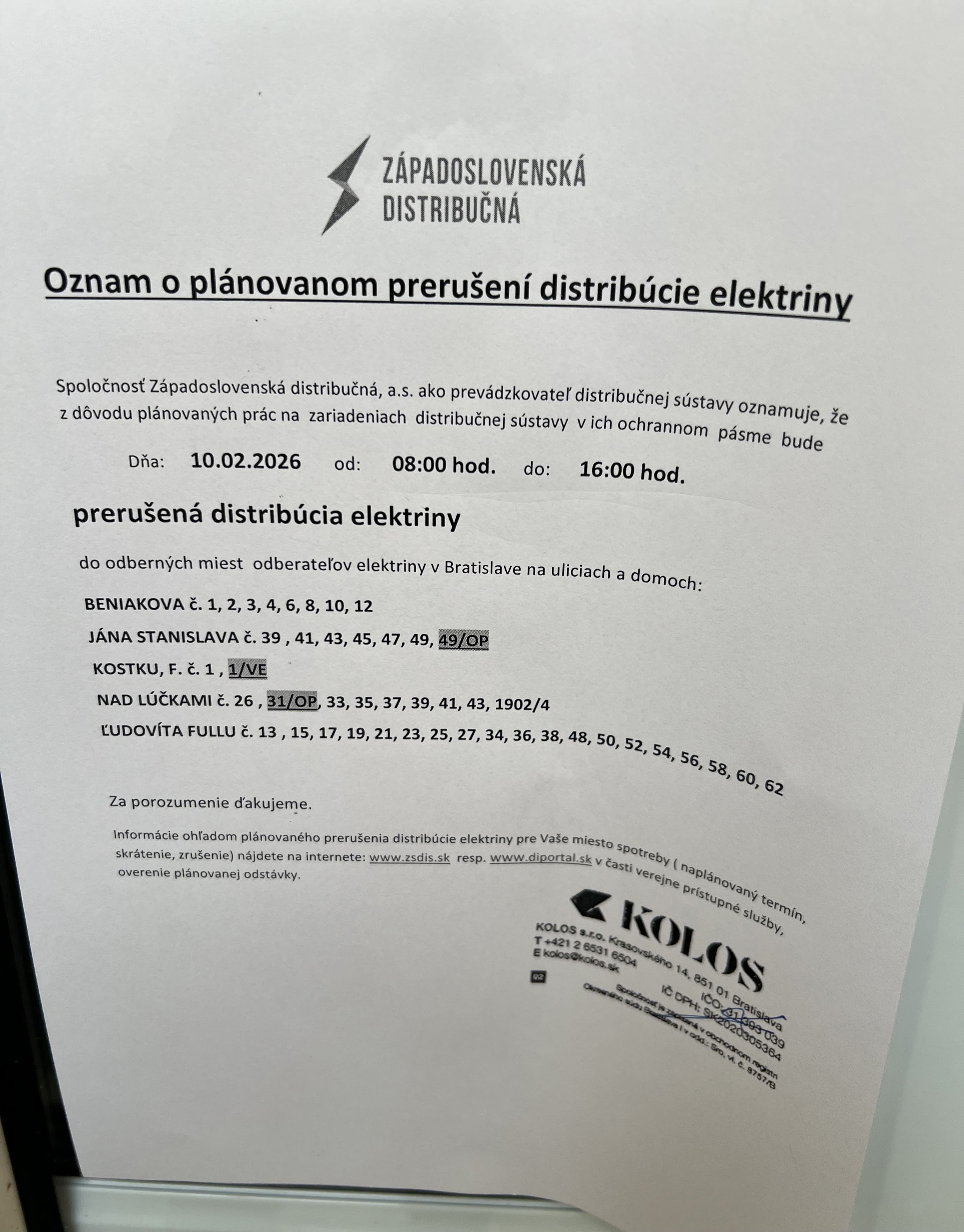 Dňa 10.02.2026 od 08:00 do 16:00 bude prerušená distribúcia elektriny na ul. Ľudovíta Fullu č. 13–62 a okolí (Západoslovenská distribučná, a.s.).